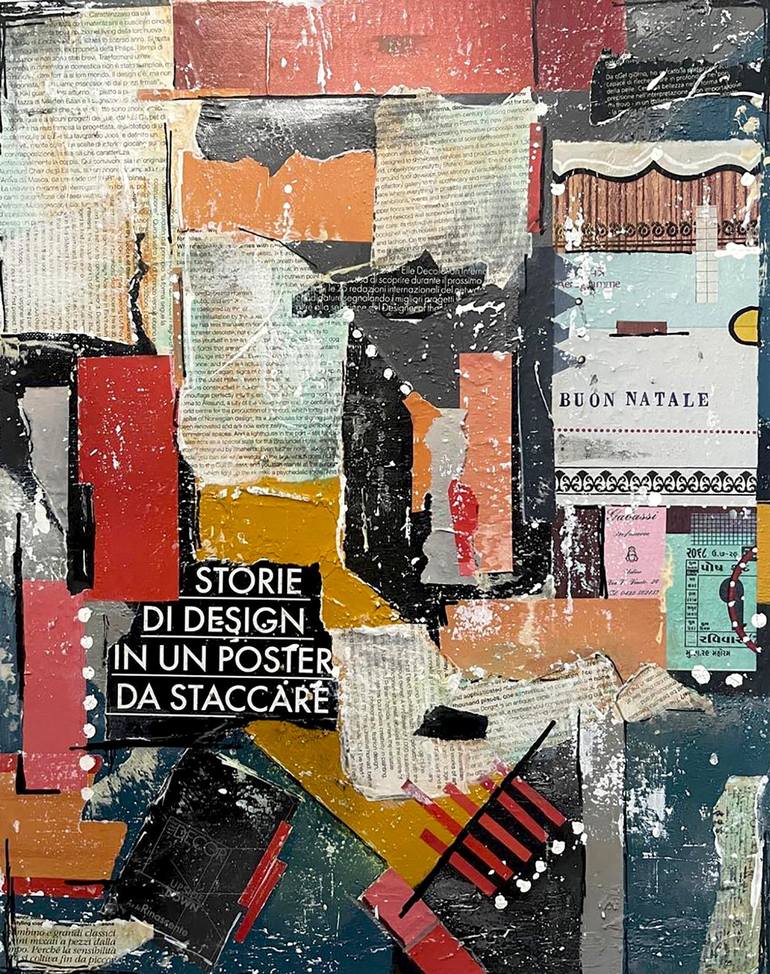 This vibrant mixed media painting is a dazzling fusion of textures and hues, evoking a sense of dynamic energy and vivid imagination. Textured elements, such as pieces of paper and bits of newsprint, are subtly integrated into the paint, adding a tactile dimension. Overall, the painting is a celebra...