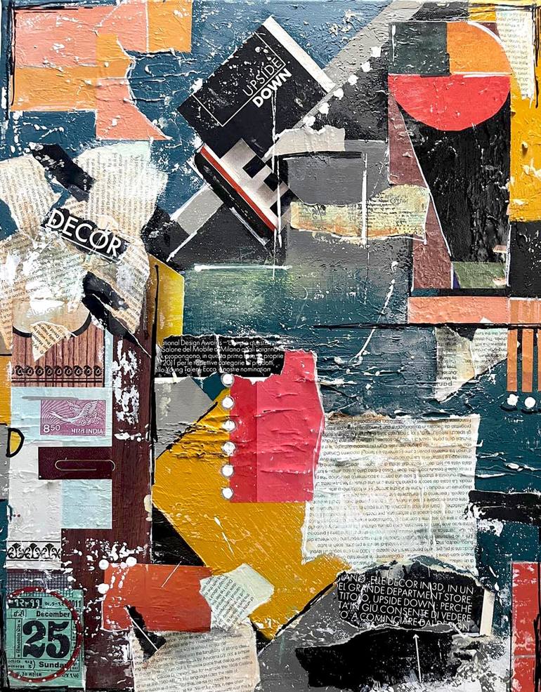 This vibrant mixed media painting is a dazzling fusion of textures and hues, evoking a sense of dynamic energy and vivid imagination. Textured elements, such as pieces of paper and bits of newsprint, are subtly integrated into the paint, adding a tactile dimension. Overall, the painting is a celebra...