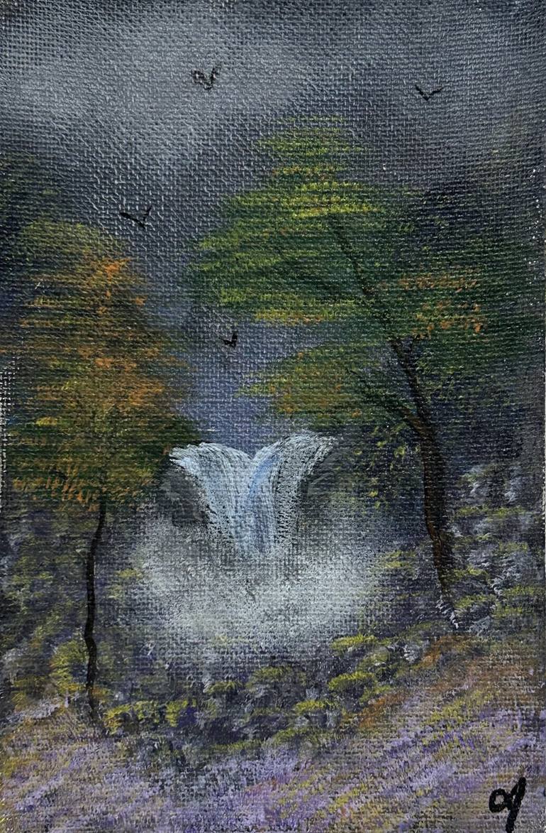 This painting is a one done on a canvas panel! It was inspired by the awe-inspiring feeling of stumbling upon a hidden waterfall deep in the forest—a place untouched, peaceful, and alive with color and movement. I imagined wandering through dense trees and vibrant wildflowers, surrounded by the stil...