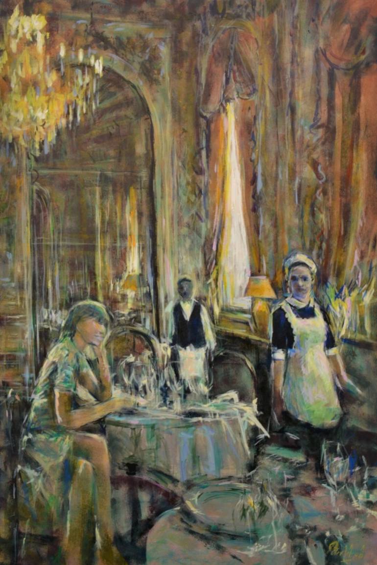 Pulling between the contemporary, the abstract and the figurative this artwork goes beyond light, colour, atmosphere, colour dimensions and planes, mood and ambience. It also has us question what "secrets", what social interaction is happening between the people in the scenes?