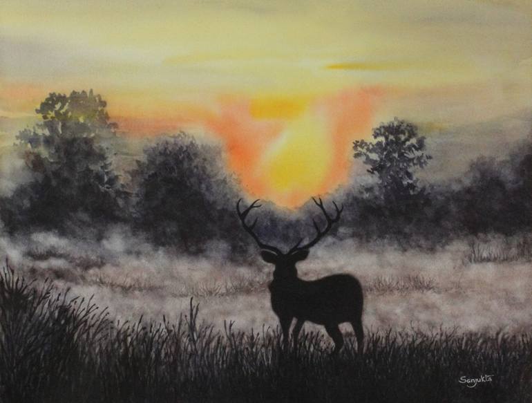 This composition is mostly from my imagination ... A lone deer, probably separated from its herd, standing in the misty grassland, silhouetted against the rising sun. He can be a lost soul, a forlorn figure, scared and sad, or ... a hopeful figure staring at the rising sun which will usher in a new...