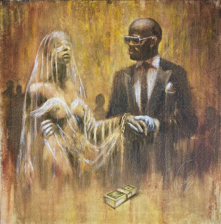 “Déjà vu” is an oil painting on canvas, created using layered brushwork and a warm, muted palette. The surface carries both softness and tension, with subtle texture in the veil and fabric contrasting the hardness of the metal chain. The work is unframed but ready to hang, and painted with archival-...