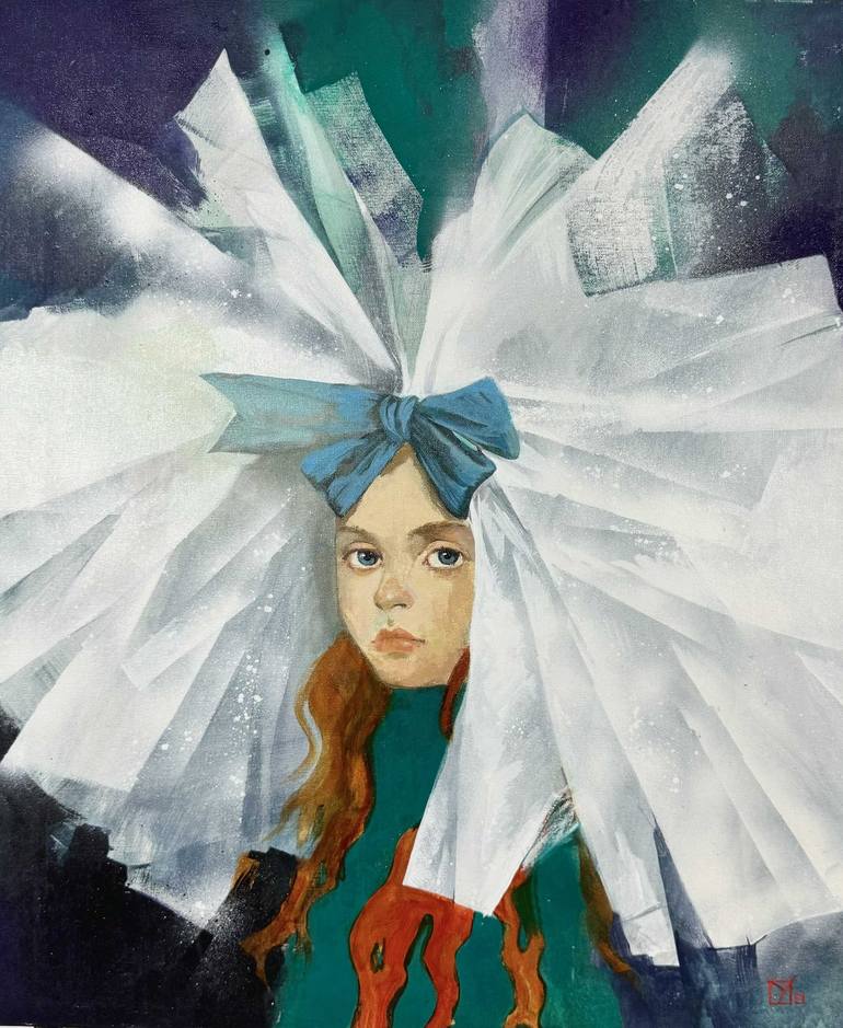 The dandelion represents a symbol of renewal and new beginnings. The girl in the painting is trying on her mum's wedding veil, it is a symbol of the desire for a new stage of life. The stage of growing up. When a little girl gradually turns into a teenager. In my paintings you can often see the ima...