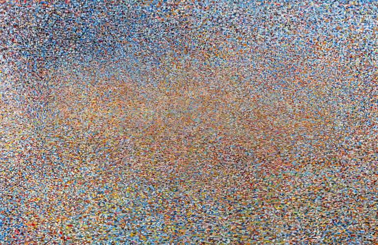 This painting was created on the highest quality Belgian linen, using top-grade tempera paints. The artwork focuses on small, molecular units, resembling a view through a microscope that forms a unified weave of dots, lines, and colorful stripes. This weave gradually develops, creating a visual expe...