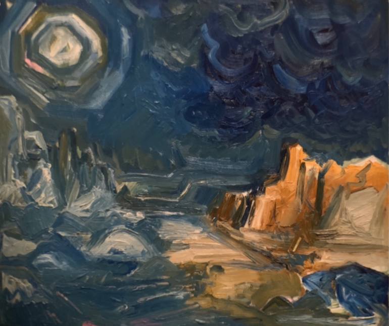 This is a close representation of a strange dream I had with a moon that had a octagonal shape, that lit a rich and beautiful desert floor.