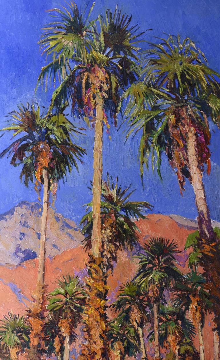Beautiful Desert Palm Trees in South California under the bright sun with their elegant shapes create an amazing contrast full of beauty and a positive vibe. Warm colors of the desert and bright blue sky outline the beauty of these trees. The artwork is on oil-primed linen. The sides are white. i...