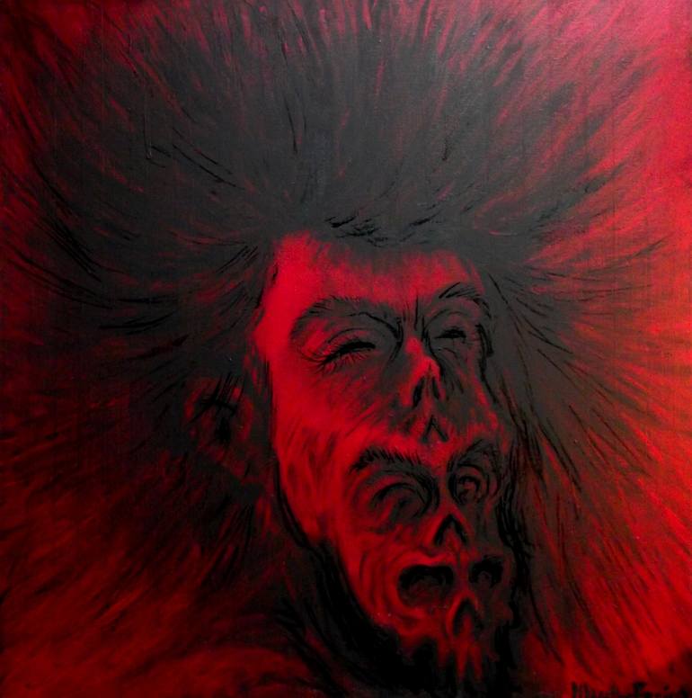 The canvas entitled “Devolution” is red and black and shows the portrait of a humanoid with a triple transfigured face and which represents primitive man, monkey and skeleton. This nihilist painting, like all of his other pieces, offers an opposing point of view to that of evolution.