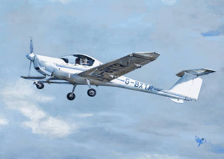 This painting depicts the Diamond Katana DA20, a sleek two-seat, low-wing composite aircraft renowned for its role as a trainer and its exceptional cockpit visibility. Rendered in oil on paper, the work captures the aircraft’s streamlined form, technical precision, and dynamic presence in flight. ...