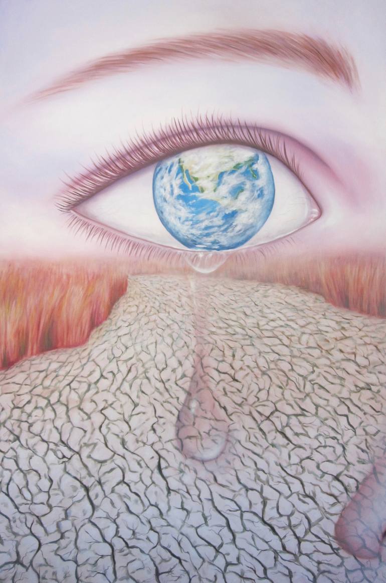 The last tear of planet Earth, represented as a human eye, flows into the bed of a dry river, symbolizing the drama of global warming caused by man to his own.