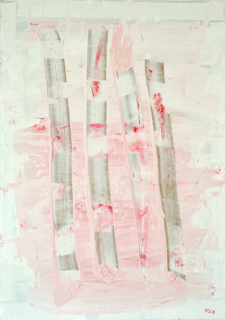 Abstract composition of gesso spread with an industrial broad brush and red oil colour poured straight from the tube on cardboard with collage elements of scotch tape. Then I remove (erase) vertical stripes of the thick layer of paint paste with a pallet knife and see the result. Here I got somethin...