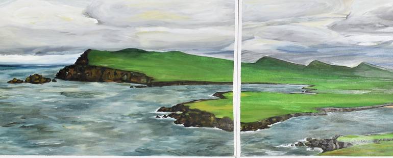 This painting of the coast at Dingle in county Kerry is an image of one of the most striking landscapes I have ever encountered. The clouds and sea mixed with the green of the three sisters hills was incredible. The painting was created from sketches and photos taken on location in Ireland. The 2 pa...