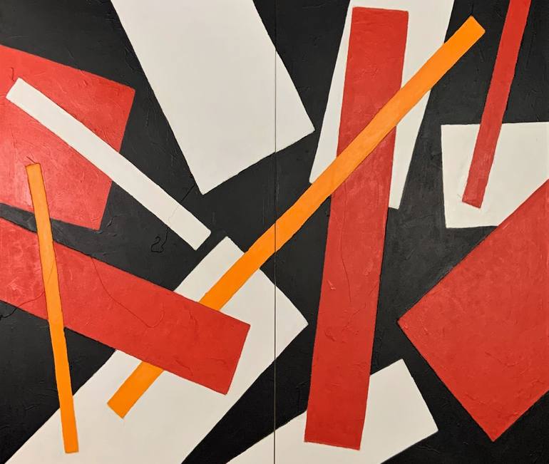 Richly textured surface of canvas applied to canvas on thickly applied gesso background, painted in almost black, white, vermilion red-orange and chrome yellow. . A diptych, which may be exhibited as shown or separated as complimentary pieces. A kinetic composition creating balanced movement and e...