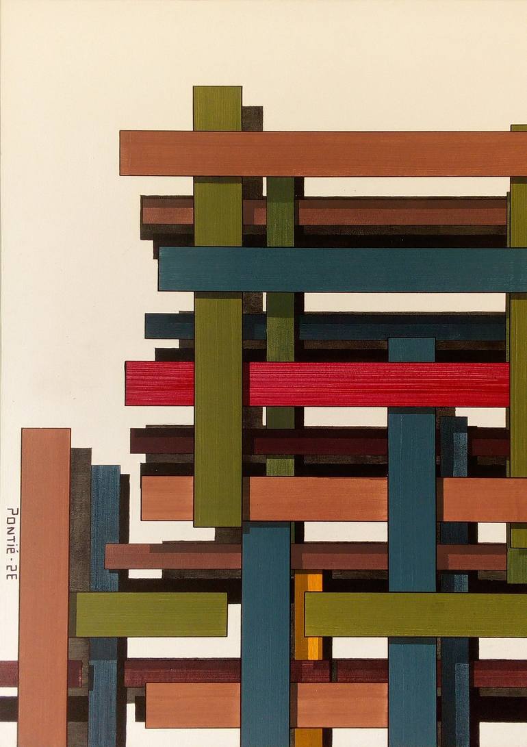 In these times when everything is digitized, Stéphane PONTIé, a French painter in Géométrical Abstraction, works painting as a fundamental component of representation. He continues to take advantage of the high graphical potential of this medium by using all his "traditional" mechanics "At first, I painted an assemblage of geometric and colorful shapes, and that's it. To want a field of expression clear and simple to realize and understand, and by affinity for the angular forms, I finally banished all the curves of my work." I decided to codify these geometric shapes, depending on their use. I use angular geometric figures for replacing the figurative form of the people: - One geometric shape = one person. - One line (straight or broken) = the trajectory of one life, a path of someone. This is how i created my universe by the invention of a new graphical syntax. I decided to give a thickness to the lines, because I wanted to use the graphic representation of the line, to symbolize a trajectory, a life, a path ... And the question of the thickness of the line is asked. It seemed logical then to use numbers with "this strange alphabet" of geometric shapes, to obtain a complete and coherent linguistic base ... and to solve problems of thickness of lines. Suddenly, watching my phone keypad, i immediately saw 3 numbers appear in the middle of all these numbers. The 1, 4 and 7 are only "no curves" numbers. I push the "concept of angulosity" even further, and I use these numvers to create the geometric figures themselves and the thicknesses of the lines. And finally, i push the limits of my concept even further, since i use these three numbers to compose everything. Up to the size of the frames of my paintings: Example 77 x 77 or 117 x 77.