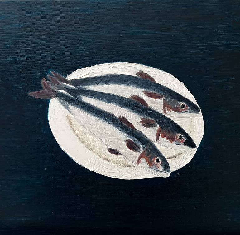 The painting depicts a minimalist and elegant still life, centered on three fish carefully arranged on a white plate. The contrast between the dark background and the light of the plate accentuates the texture and detail of the fish, their silvery reflections testifying to the skillful play of light...