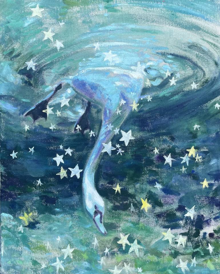 I painted this piece as a dreamy farewell to summer. Combining the image of the diving swan with the stars. Is the swan in the sky, or are the stars underwater? I painted with acrylic on a raw piece of stretched canvas, so it took a while to build the colors and the texture of the canvas is quite p...