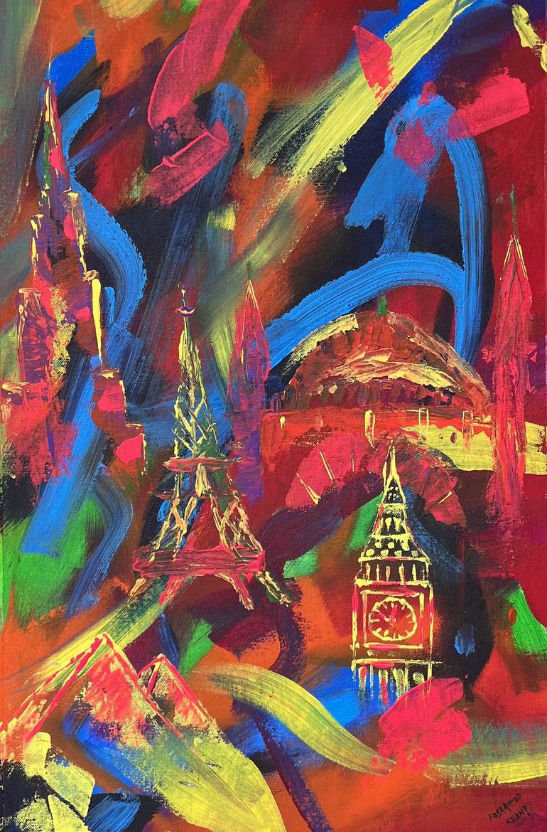 This original abstract painting, "Divergent Destinations" by Aqsa Raja, invites you to embark on a visual journey. The bright colors and dynamic composition capture the essence of iconic landmarks, bringing a sense of worldly peace into your space. The artwork is signed by the artist on the back and...