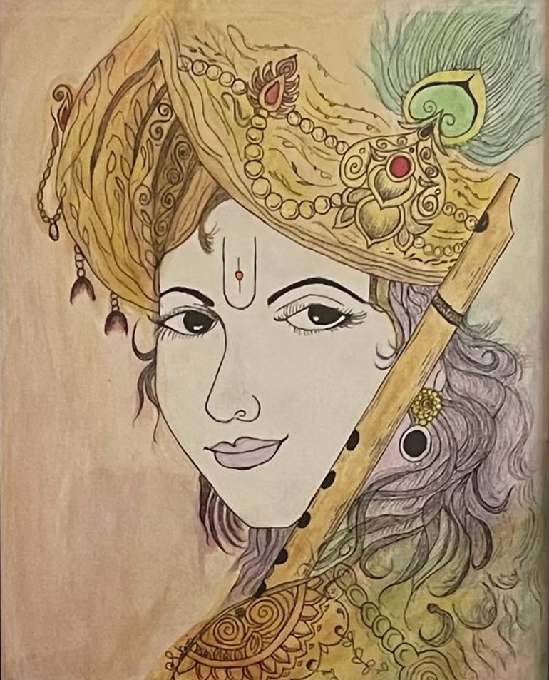 "Divine Krishna" portrays Lord Krishna in a serene and composed manner. Adorning his wavy hair is a single peacock feather, a symbol of his connection to nature. His royal headgear graces his noble countenance. This portrait radiates a profound sense of inner calm, inviting viewers to connect with...