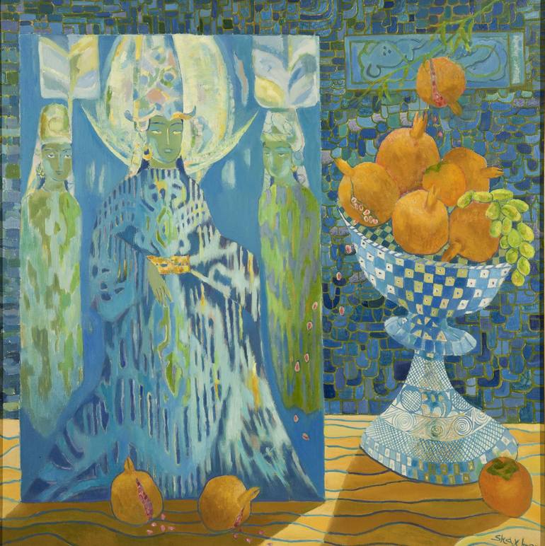 "Our Angels are always present."-Paulo Coelho Is it possible to imagine a more vivid symbol of Central Asia than the face of a shy maiden of glorious beauty, wrapped in precious silks, radiating a sense of heavenly bliss... How often the works of artists are a mirror image of their own inner essence - and the works of Shakhnoz Abdullaeva, like a unique kaleidoscope, conjure up a picture of this amazing woman with the soft smile. And as you look at it, you begin to believe in the world she has created of angels and eastern princesses... Shakhnoz Abdullaeva's name is well known to connoisseurs of modern Uzbek art. Against the background of the symbolic-metaphoric school, quite popular in the art world, her canvases are immediately recognizable - thanks to favorite groupings of images developed during her years of work, and the meditative tone of her canvasses which fascinate the onlooker with their ornamentation and the richness of her palette... Her artistic journey began at the end of the 1980s, when the attempt to identify a national school of art was once again high on the agenda for Uzbekistan's artists. The Еast, wrapped in mystery, reveling in the spice of life and a painting technique of exquisite linearity, became a leading theme. Shakhnoz's creative work has developed, however, not so much under the influence of contemporary trends but as a result of the circumstances of her personal life - she grew up in the home of Chingiz Akhmarov, the outstanding muralist, painter and graphic artist, whose career stood as an example of the freedom of creative self-expression. It was Akhmarov who inspired Shakhnoz with love for the artistic heritage of East and West. She made her first choice with his blessing when she turned to the style of medieval frescos. The ceremonial scenes of feasts and royal receptions, mystical tribal dances and sacred rituals,seemingly taking place in an atmosphere outside of time - these characteristics give frescos their inimitable charm. One of Shakhnoz's first works of this series was "Ajanta," devoted to the Indian cave temples and monasteries. This was the origin, Buddhist paintings, of her device of depicting angels and goddesses with blue faces in her works - an allusion to their divine favor, the embodiment of a connection with a higher, heavenly world.