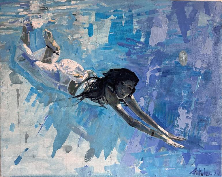 Video link: https://www.youtube.com/watch?v=aEnw7YKpHHo This oil on canvas depicts a person swimming underwater. The figure is depicted in a horizontal position, with arms extended forward and legs slightly bent. The background is composed of a mix of blue and white tones, suggesting the movement o...