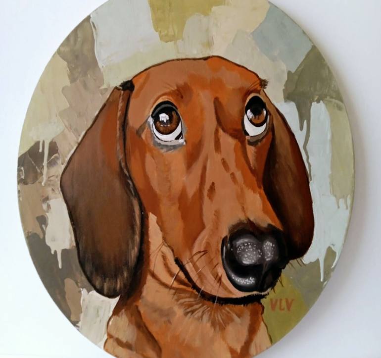 Portret of a dachshund dog. This is an original painting painted whis acrylic on round canvas. I paint portraits of your favorite pets from photos. I paint with acrylic or oil. Contact me, send me a photo, we will discuss the details. After finishing the work, I will send you a photo of the p...