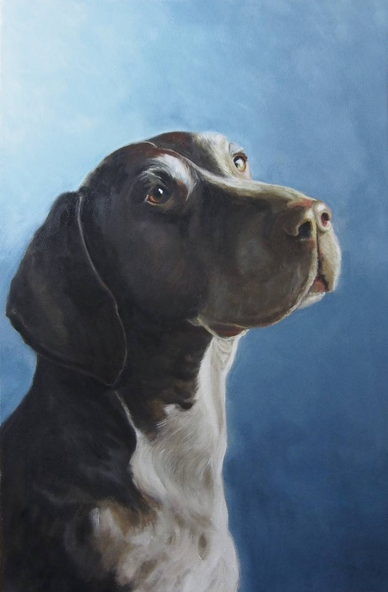 This is a larger than life portrait of a hunting dog. It is the fourth painting in the series "Doggedly". I was commissioned to do a portrait of a little girl and while I was getting to know her I met her dog and immediately decided that I would also do a portrait of her beautiful pet. It took lo...