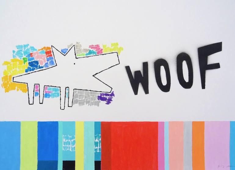Dog Woof. Acrylic, spray paint, pencil on paper 2024. Signed by Andy Shaw. Ready for framing.