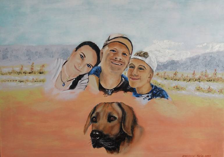 "Dog always think happy", 2020, oil on canvas, 50cm x 70 cm. A portrait of the family with dog of my girlfriend. Many pet owners know how happy the connection between animal and human is. Signed on the front right. with hanger to hang on the wall