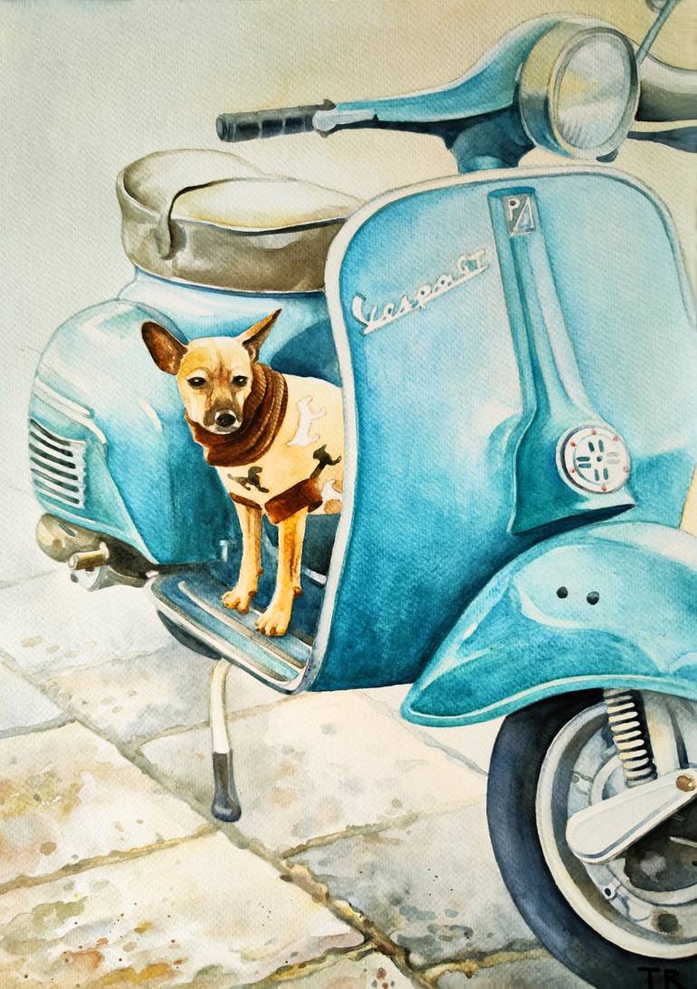 Title: A Dog on a Vespa This is not a print! This is an original handmade painting. Painted with professional watercolor paints on professional watercolor paper Fabriano. Please read the item description. A Dog on a Vespa painting original is perfect for home decoration. A Dog on a Vespa watercolor...