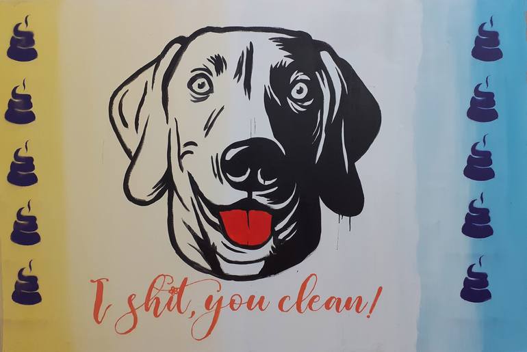 This playful, satirical painting takes a humorous look at the dynamic between dogs and their owners, capturing an aspect of everyday life that dog owners know all too well. The central focus on the dog’s expressive face, painted with bold lines and a pop of red on its tongue, brings a sense of perso...