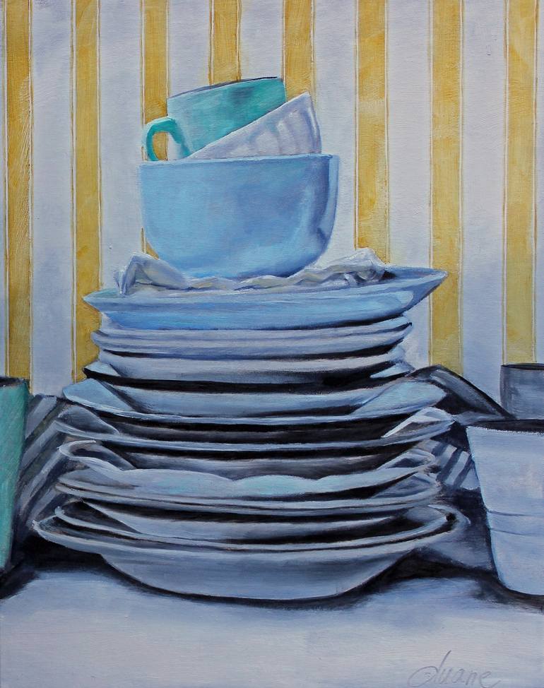 Stacks of dishes are a favorite of mine. This painting was first finished with a plain solid background, but after passing by it every day for a week, I decided to give the background some life. The adding of the stripes can be viewed in a short video on my site