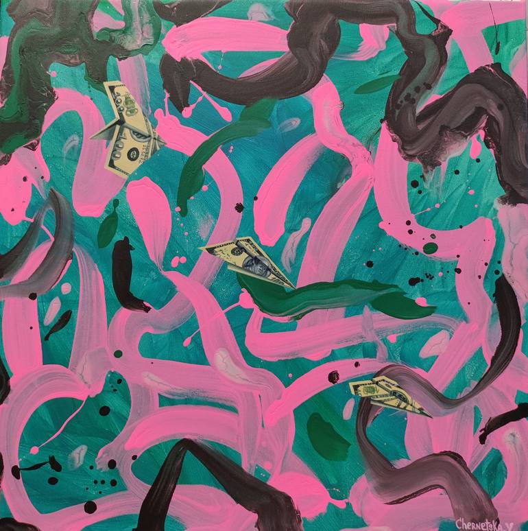 This is an abstract painting with airplanes made of money. Everyone loves money $. This picture attracts dollars. Who ever buys it, it will inspire and please the eye, and bring a lot of happiness $. The painting format is 50*50, painted with acrylic and oil paints, with the addition of gold. Privat...