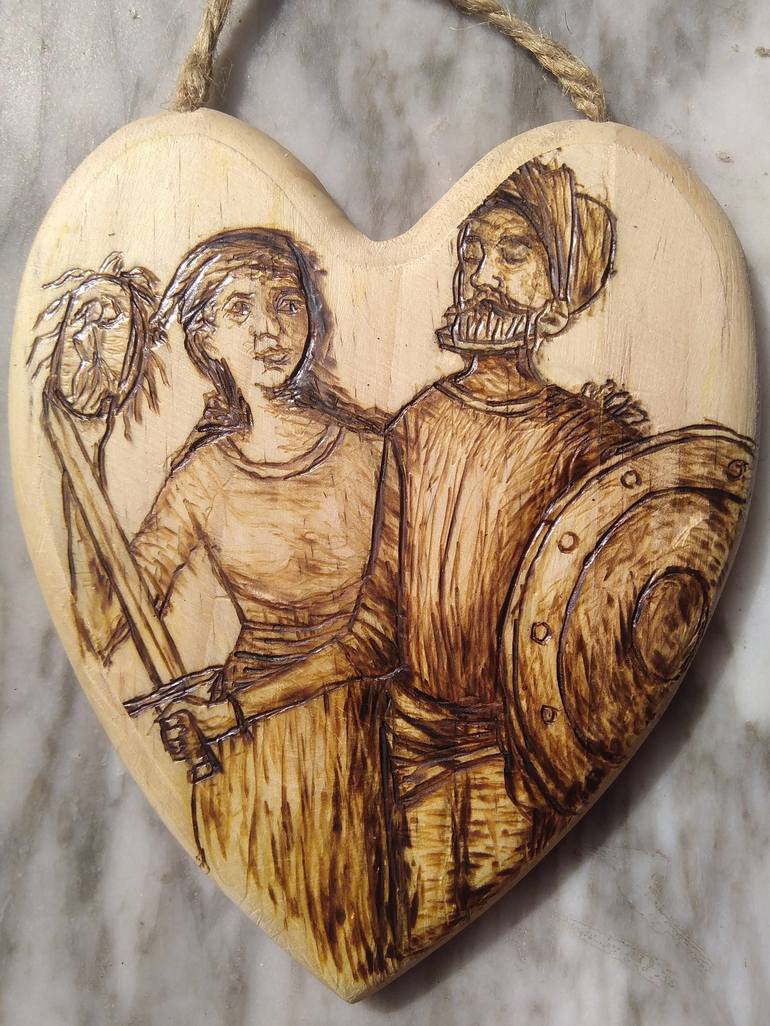 my work is inspired by the famous Spanish classic: Don Quixote My work represents the famous couple: Dulcinea and Don Quixote. My work represents the admiration that Dulcinea feels for the famous gentleman My work is a beautiful pyrography made on wood of excellent quality