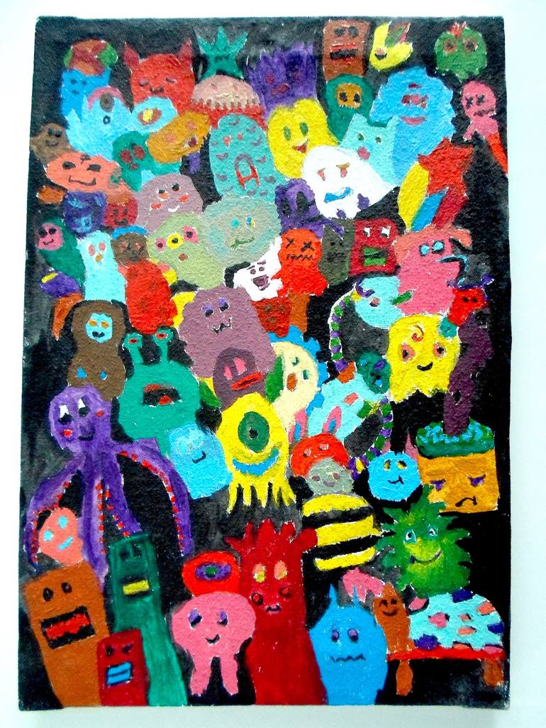 Style: Bold and playful, reminiscent of childlike scribbles and spontaneous creativity. The densely packed composition creates a sense of movement and visual overload, like fireworks against a black canvas. Color palette: A kaleidoscope of bright, eye-catching colors, likely with contrasting hues a...