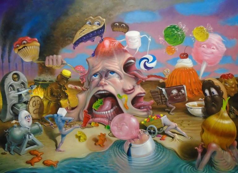 This surreal painting by Canadian artist Stephen Gibb portrays a commentary on consumerism symbolized by the central figure of the all-consuming-mouth monster devouring candy, pastries and chocolate. The central elements contain benign, candy-coloured characters but give way to the austere, menacing...