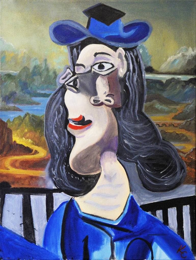 A mash-up for my painting class under Frank Trankina at Northern Illinois University. "Take at least two masterpieces and combine them." The background is from the Mona Lisa (Leonardo) and the subject is Lady with a Blue Hat (Picasso).