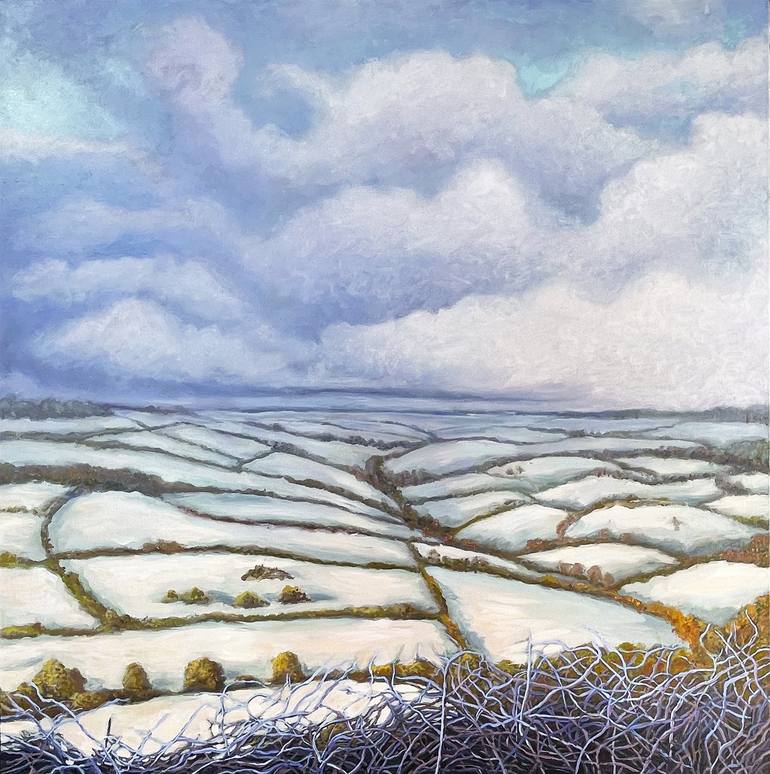 Dorset Snow 2 is an evocative oil painting inspired by the English West Country. Snow-covered fields and ancient drystone walls reflect generations of agricultural life etched into the land since Neolithic times. The artist explores how location shapes family and social history, with paddock structu...