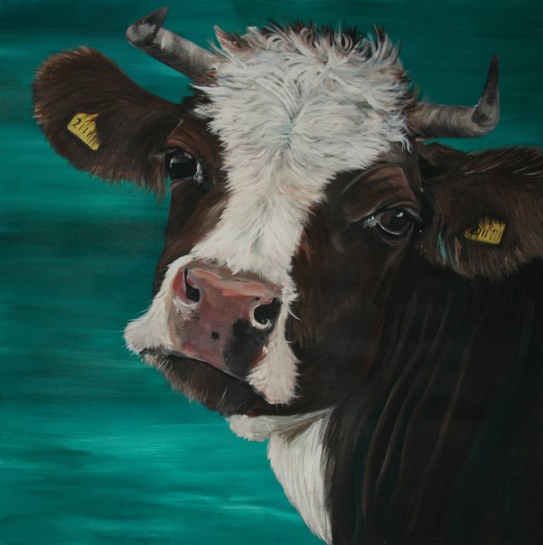 The background is painted in a really intense Phtalo green color mixed with some white and blue. The cow has a nice dark brown color with some small touches of pthalo green. The cow looks very tough but cute at the same time. I do not wipe my brush between changing colors which leaves the cow with b...