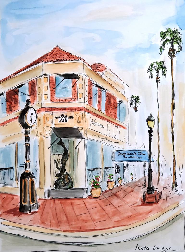 This lively watercolor painting encapsulates the breezy coastal charm of The Doryman's Inn Oceanfront 21 Hotel in Newport Beach. Though simplified in detail, the painting conveys the tranquil, relaxing atmosphere of this beachside eatery. Both nostalgic and contemporary, the artwork evokes the timel...