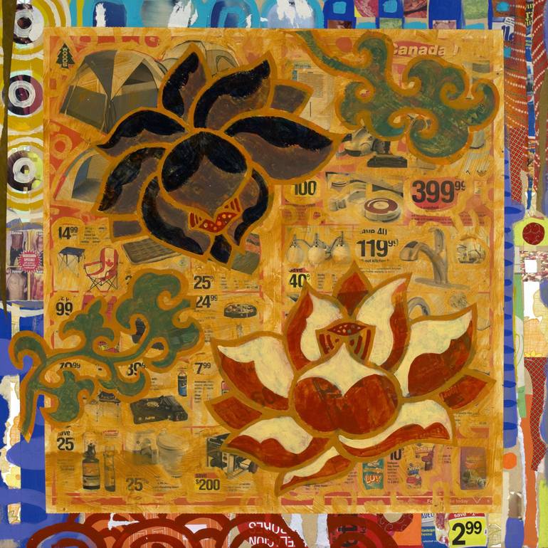 Two flowers painted on a newsprint circular selling tents, faucets, pet food... on wood. I wanted to use these visually vibrant ads as a starting point, as pattern, texture and color to improvise on top of. In the end creating a contemporary take on the botanical prints from the previous turn of t...