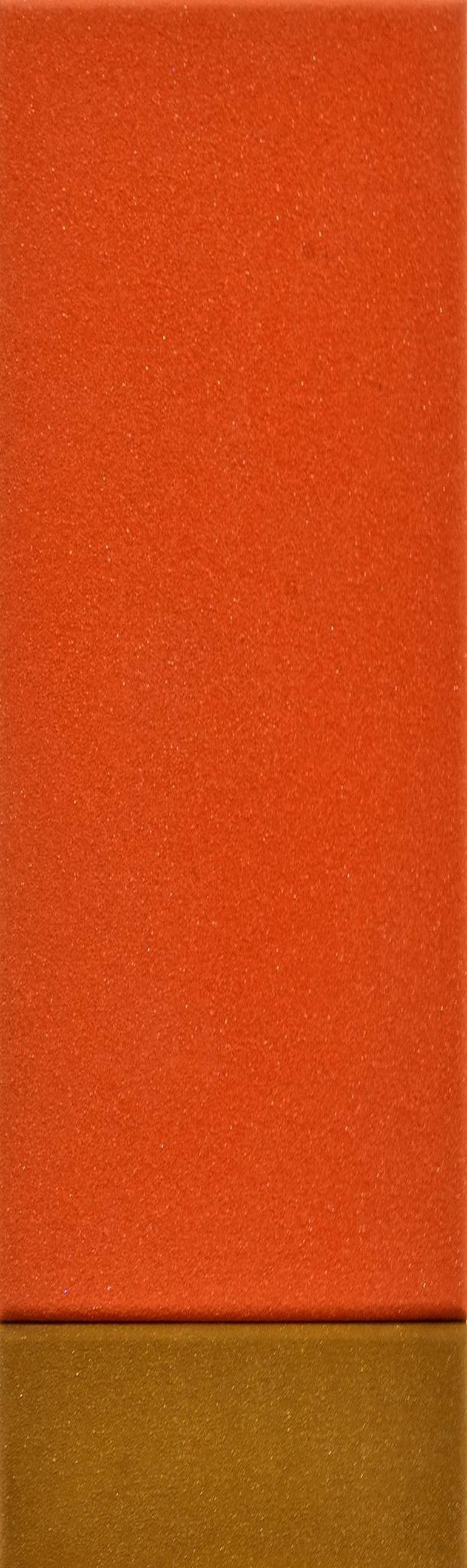 "Two oranges and one ocher" is a sculpture painting made on DM with micro crystals on orange and ocher pigments with resin. The tilted frame is behind the work, painted a fluorescent color that reflects orange light. Likewise, crystals and minerals reflect artificial or natural light creating an in...