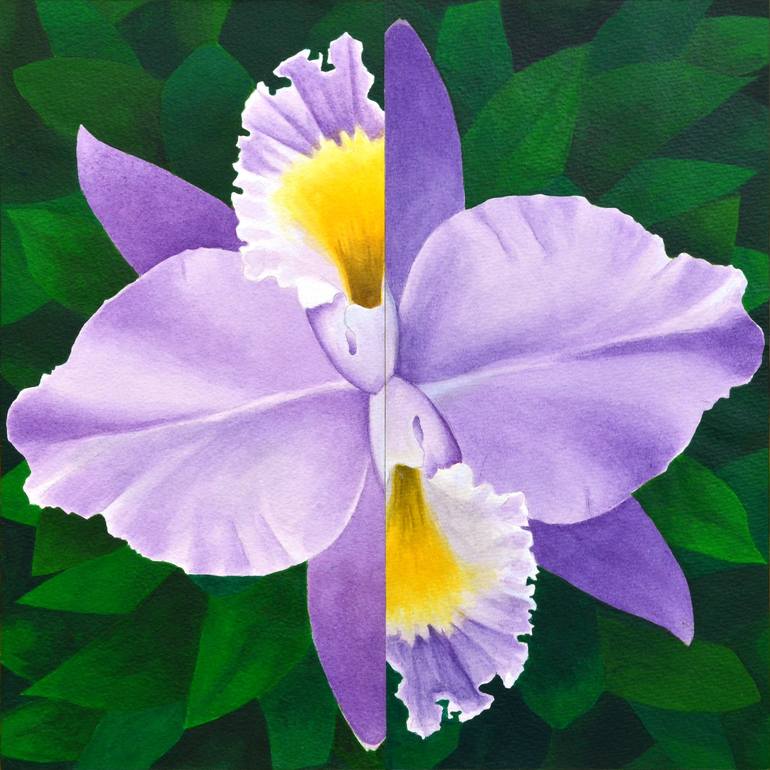 Painting in acrylic on watercolor paper and wood. It is the image of half orchid painted twice time and assembled to create an only one flower.