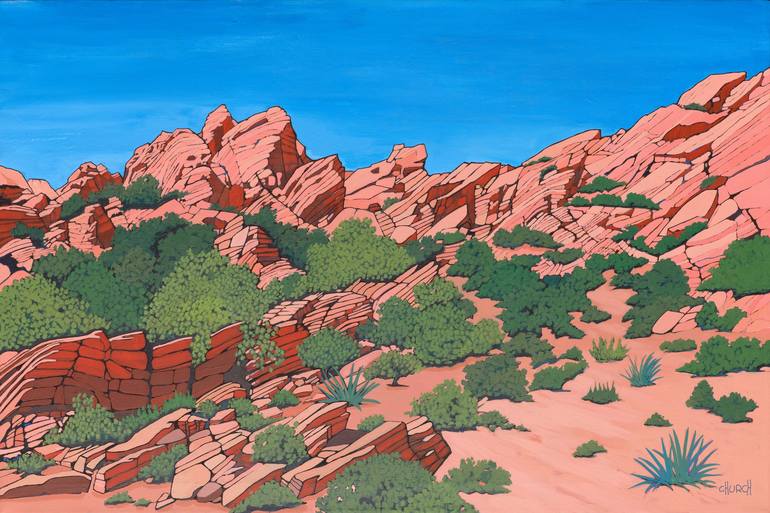 DOWN TO BABYLON Acrylic on canvas. 24” x 36” The Red Cliffs Desert Reserve in Southern Utah An ancient underground forced up through desert sand. Exposed now as surface cracks and tortured seams of rock. A landscape that bears witness to a monumental upheaval.