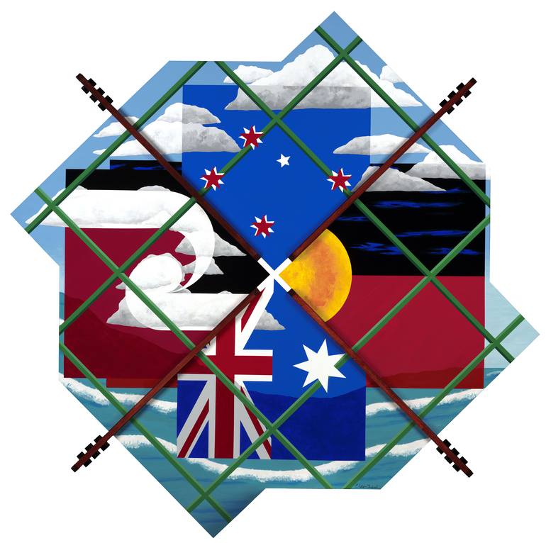 Multi panel composition comprising elements of the flags of New Zealand, Australia, Maori Sovereignty, and Australian Aboriginals. The quadrant panels are fabricated from re-purposed materials.