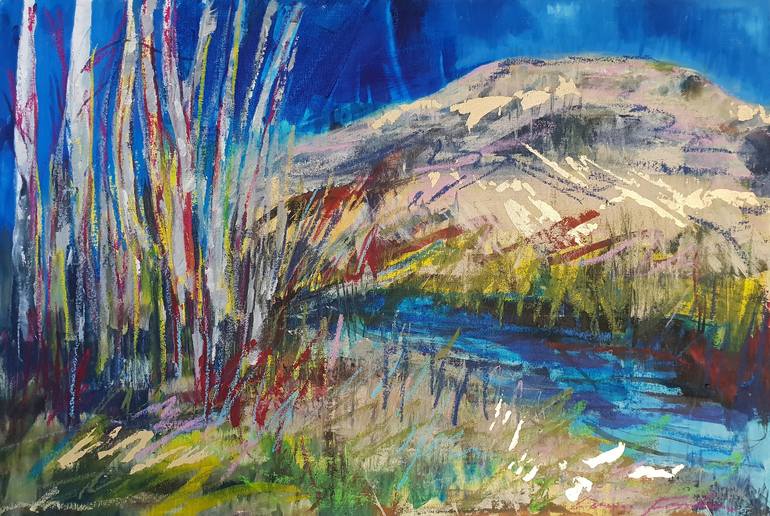 The sky is deep blue that seems to typify in the Australian Outback. The tall gums give shelter by the waterhole and the granite outcrop is mirage like in the heat. The colours are rich and bold - blues, greens, magenta, ochre, yellow and grey with hint of pink and purple . Gold leaf highlights are...
