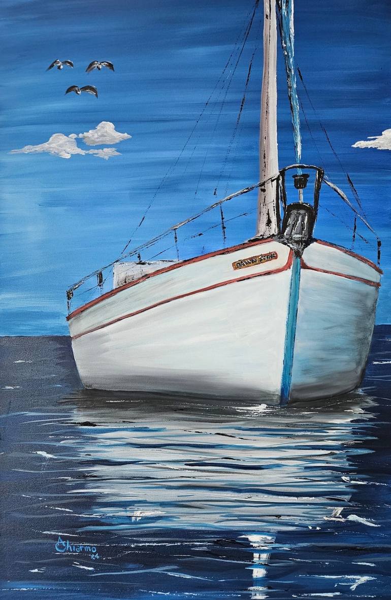 This oil painting evokes a sense of peace and serenity as it portrays the ship facing the vast sea without sails, only with its mast upright. The absence of movement in the water suggests a stillness that invites reflection and contemplation. The blue sky, adorned with seagulls in flight, brings a s...
