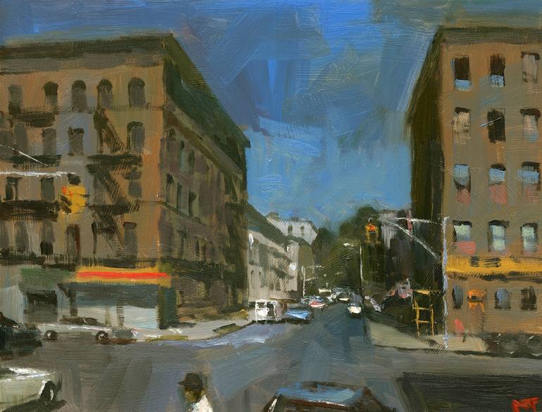 Down the Street is part of a series depicting cityscapes. As in most of my paintings, I use subdued colors and loose brush strokes in order to create the mood and feel of spontaneity. Art buyers may see a symbolic reference to prominent 20th century American painters like George Bellows, John Slo...