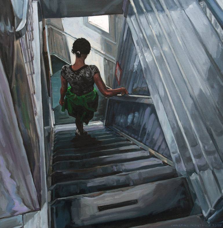 "Down the Kincardine Lighthouse Stairs" is a realism oil painting portrait of young woman on the brink of adulthood. She steps out of the grey area and into her future in the light. On this last summer vacation, she is at the end of a tour of a historic lighthouse (the interior is that of Kincardi...
