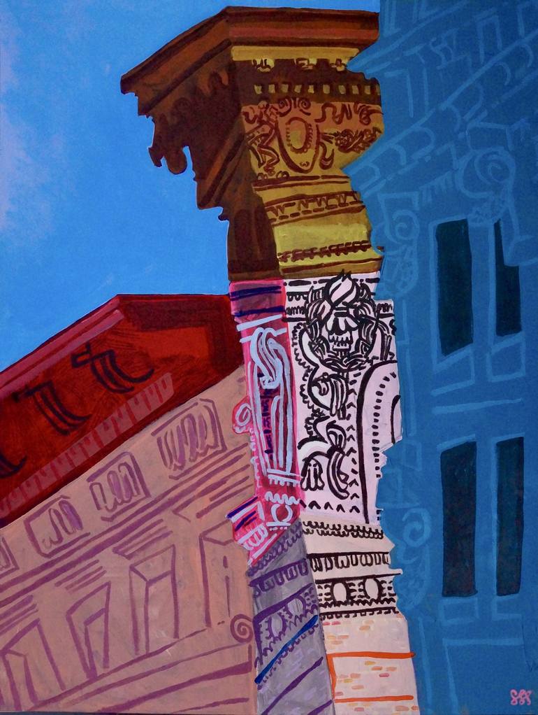I love architectural details. I also love getting elevated looks at architecture. I approached this as a tone poem, a chance to coordinate form and color and line to my liking. I am most proud of the feeling of sunlight produced ob the middle structure. And, obviously, the loose, musical feeling...