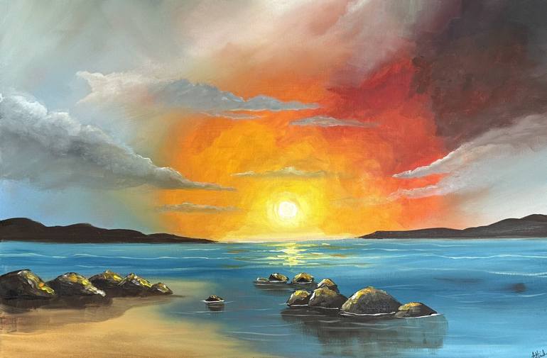 A dramatic sunset paints the sky with vibrant hues of orange, red and yellow as the sun dips. The clouds are tinged with deep blues creating a sense of calm and awe. The whole scene evokes a feeling of fleeting beauty, where the day gives way to the tranquil embrace of the night. This painting ha...