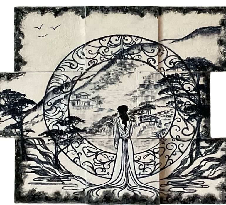 This encaustic, oil and charcoal painting is steeped in symbolism of life and choice. Swirling tendrils of earth representing 'the world of people' form the base from which the figure is either arising or being consumed. The filigree moon gate is a gateway of choice through which the figure may deci...